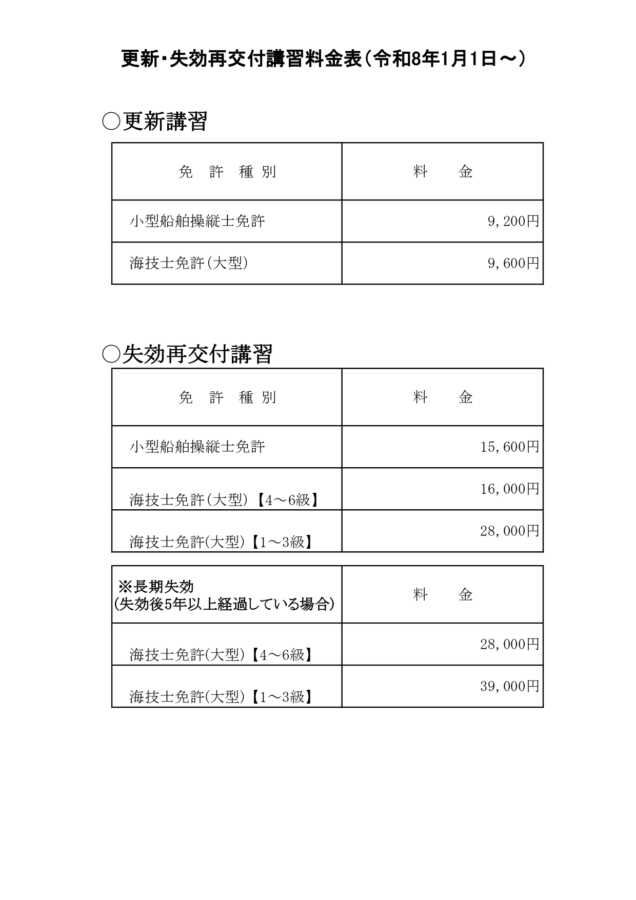及び海技士免許の更新講習・失効再交付講習料金の改定をいたします。